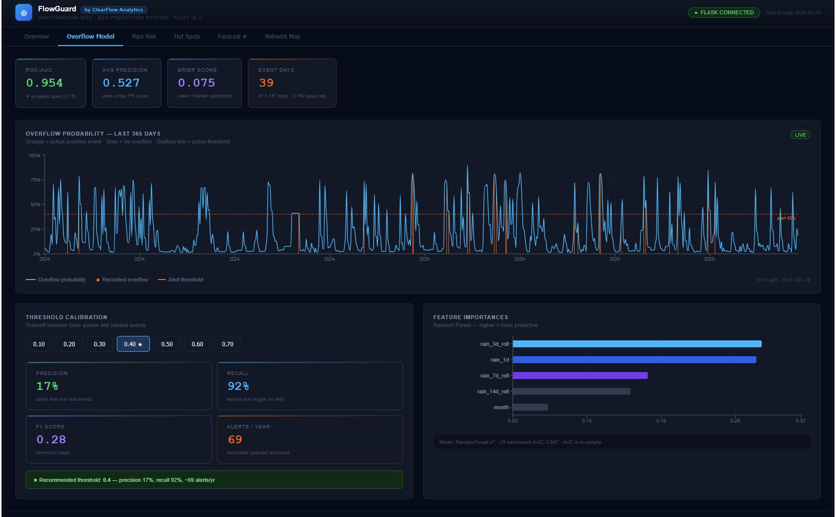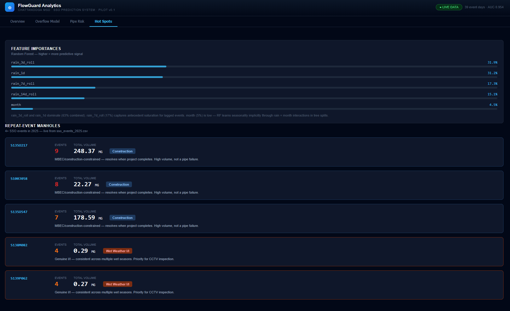 Integrates 39 event days of labeled data (2021-2025) with real-time weather and soil moisture monitoring. The model uses Random Forest classification on features including rainfall patterns (1d, 7d, 14d rolling windows), soil saturation, and infrastructure attributes. Performance metrics show 95.4% ROC-AUC with conservative threshold calibration for operational deployment.