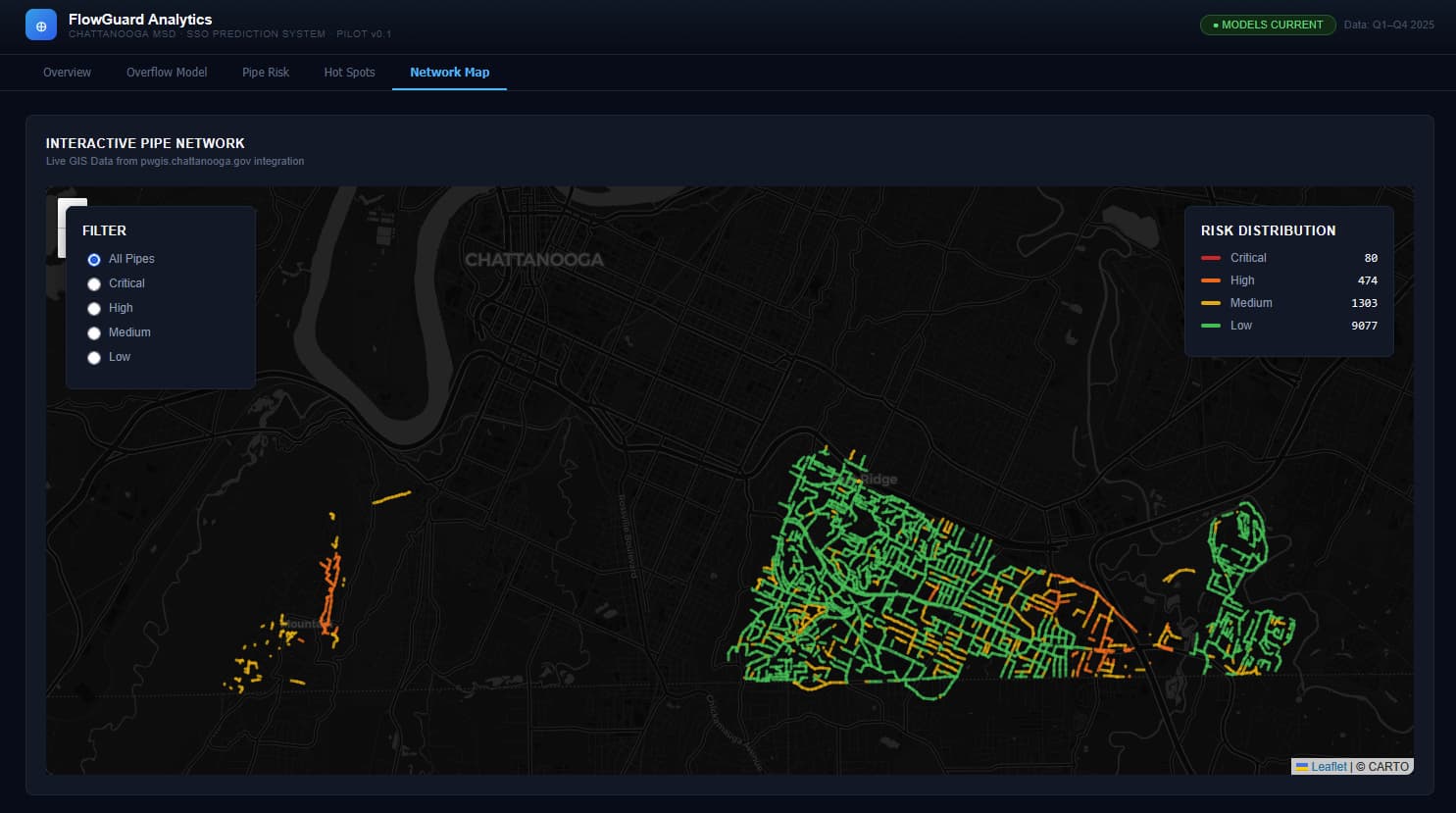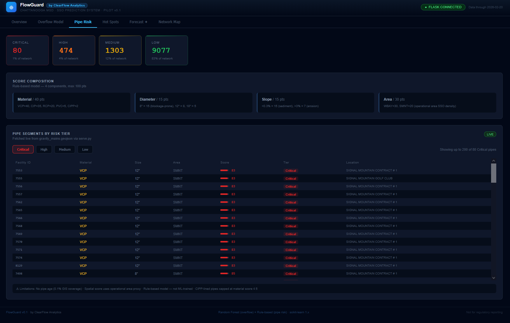 - Pipe risk distribution across 4 severity tiers (Critical >80, High 60-80, Medium 40-60, Low <40)